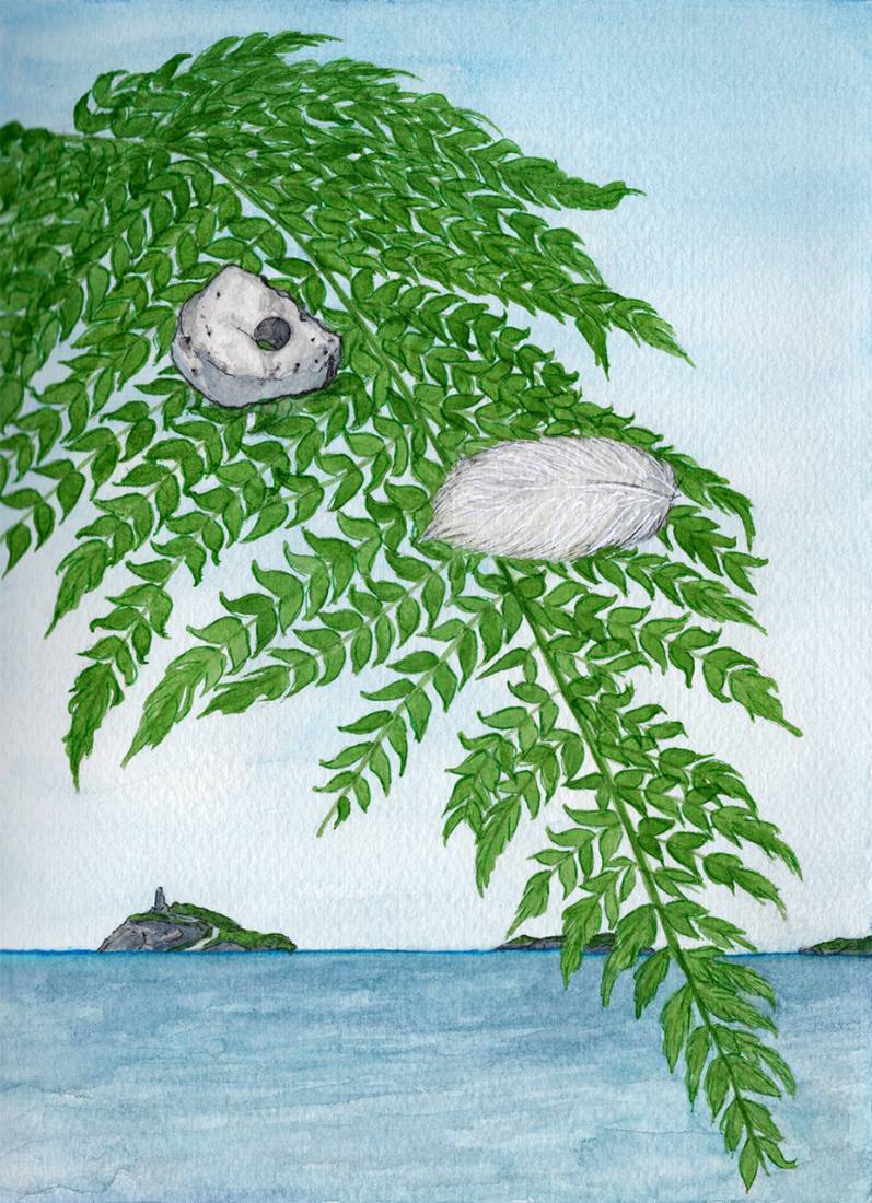‘Hagstone/Feather (Garryvoe/Glenbower)’ is a response to Lisa Robert's poem "Eat, Hew (an erasure of Leda and the Swan)" Much of my studio research relates to themes of the uncanny and (dis)embodiment, often through the lens of ancient sculpture—particularly Greek and Roman. I drew immediate links between the subject matter of Robert's erasure poem (which itself utilized the work of an Irish poet) and her actual act of erasure with the themes I have been exploring in my own work. For this painting, I was inspired by the seaside of Garryvoe and the forest of Glenbower Wood, blending elements from the two into one composition.